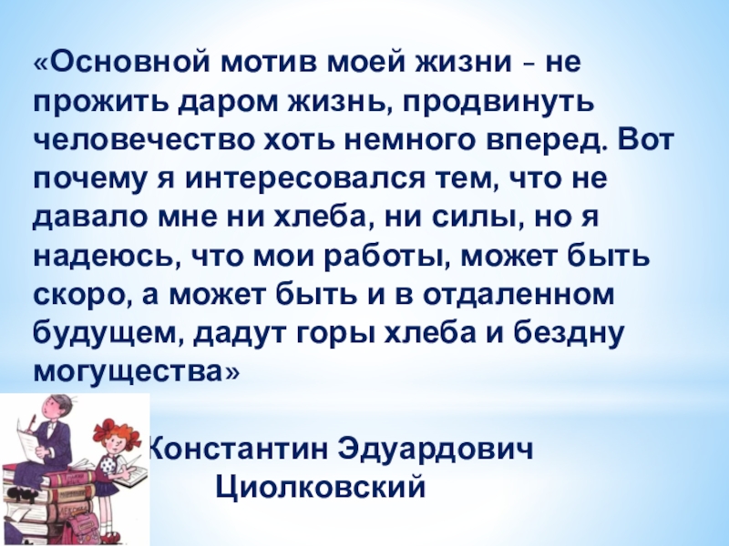 Слайд 21«Основной мотив моей жизни - не прожить даром жизнь, продвинуть человечество
