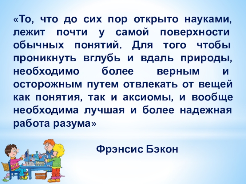 поверхности обычных понятий. Для того чтобы проникнуть вглубь и вдаль природы, необходимо более верным и осторожным путем отвлекать от вещей как понятия, так и аксиомы, и вообще необходима лучшая и более надежная работа разума»