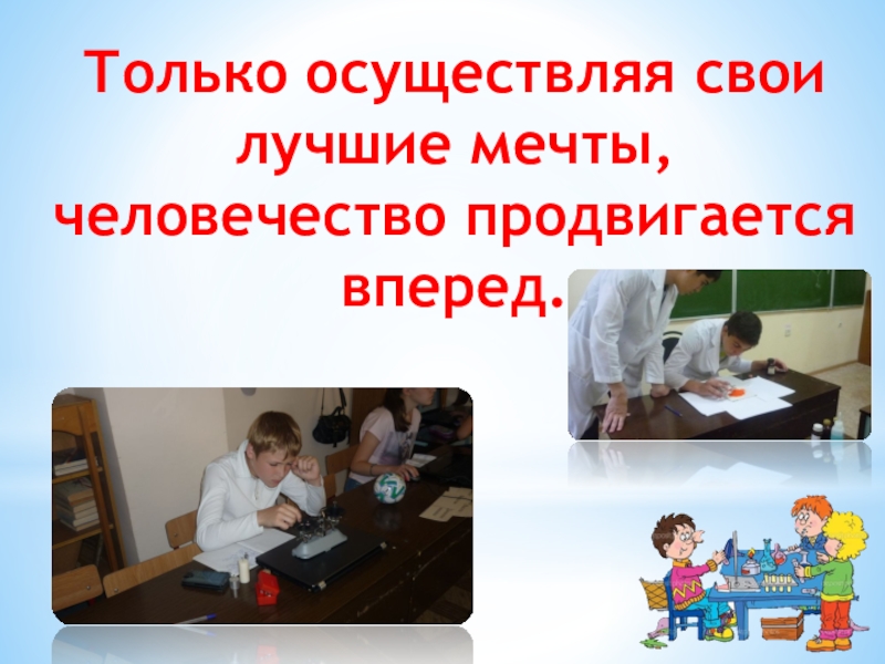 Слайд 12Только осуществляя свои лучшие мечты, человечество продвигается вперед.