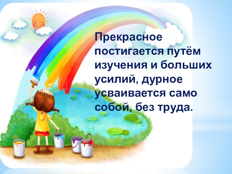 Слайд 5Прекрасное постигается путём изучения и больших усилий, дурное усваивается само собой,