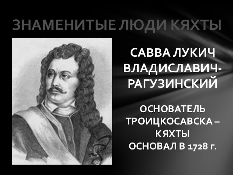 ЗНАМЕНИТЫЕ ЛЮДИ КЯХТЫСАВВА ЛУКИЧ ВЛАДИСЛАВИЧ-РАГУЗИНСКИЙОСНОВАТЕЛЬ ТРОИЦКОСАВСКА – КЯХТЫОСНОВАЛ В 1728 г.