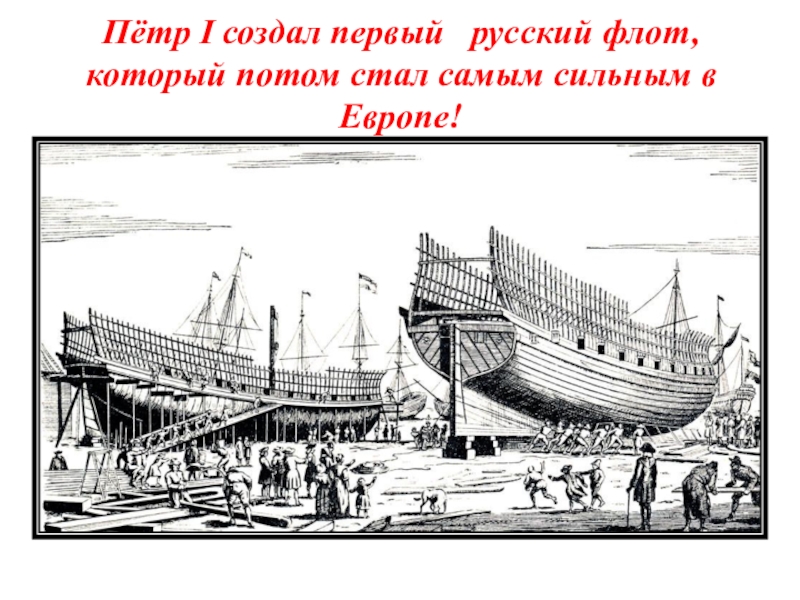 Слайд 5Пётр I создал первый русский флот, который потом стал самым сильным
