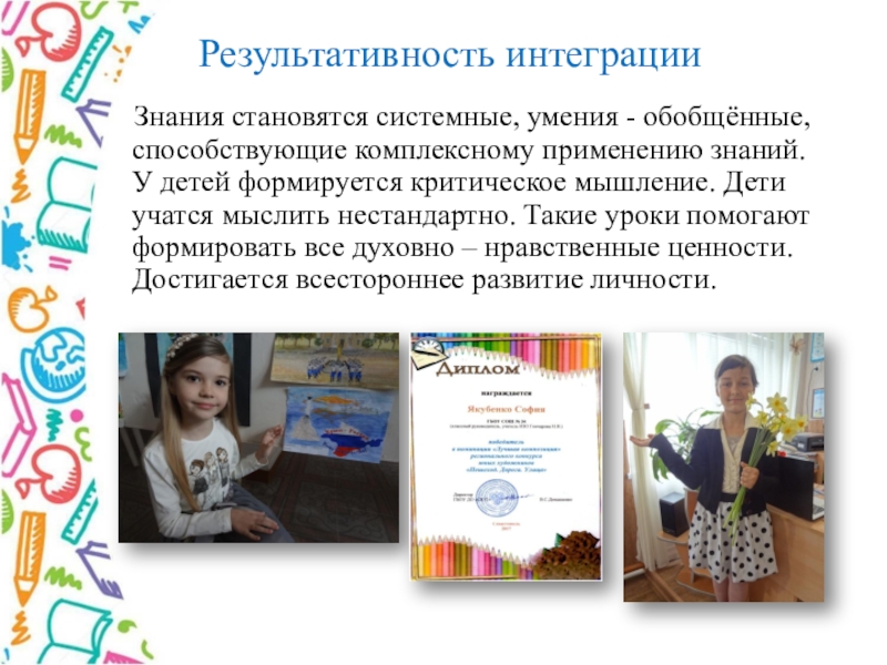 комплексному применению знаний. У детей формируется критическое мышление. Дети учатся мыслить нестандартно. Такие уроки помогают формировать все духовно – нравственные ценности. Достигается всестороннее развитие личности.