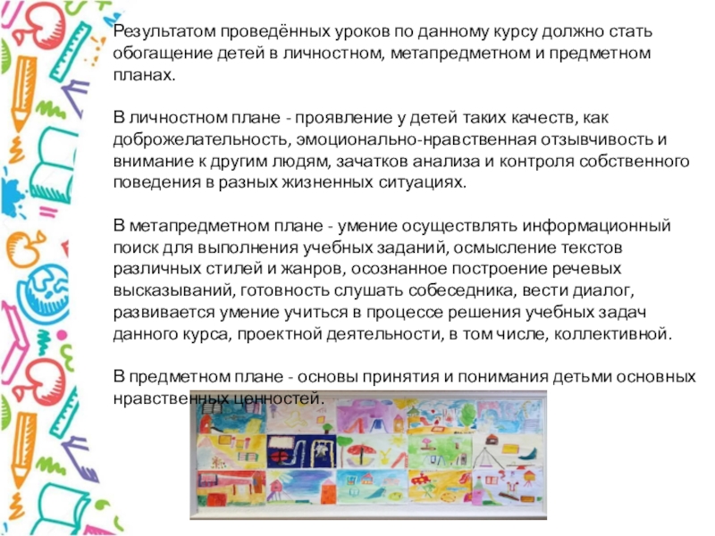 В предметном плане - основы принятия и понимания детьми основных нравственных ценностей.
