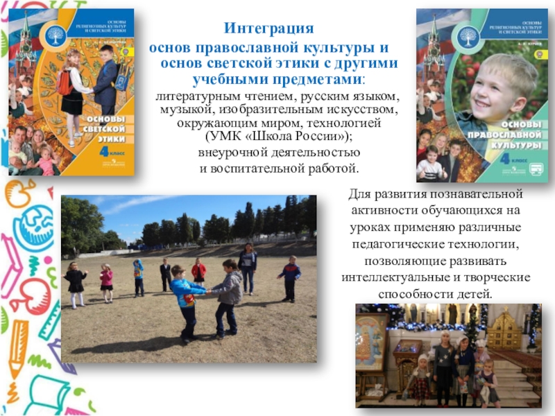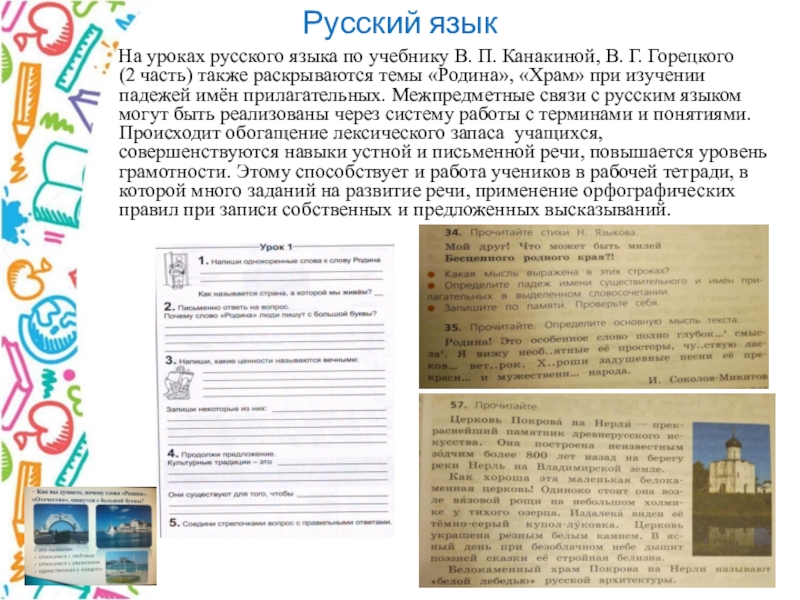 В. П. Канакиной, В. Г. Горецкого (2 часть) также раскрываются темы «Родина», «Храм» при изучении падежей имён прилагательных. Межпредметные связи с русским языком могут быть реализованы через систему работы с терминами и понятиями. Происходит обогащение лексического запаса учащихся, совершенствуются навыки устной и письменной речи, повышается уровень грамотности. Этому способствует и работа учеников в рабочей тетради, в которой много заданий на развитие речи, применение орфографических правил при записи собственных и предложенных высказываний.