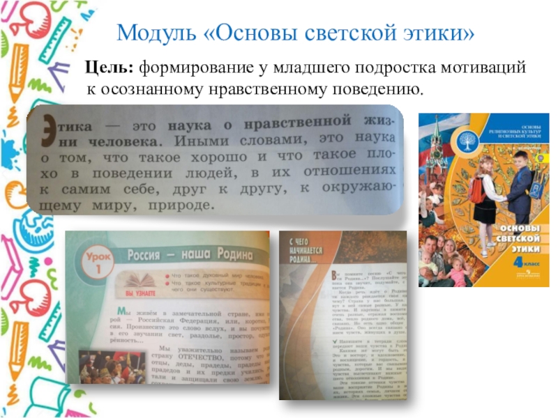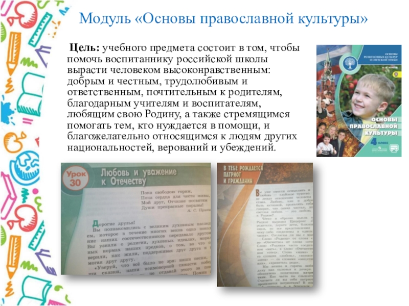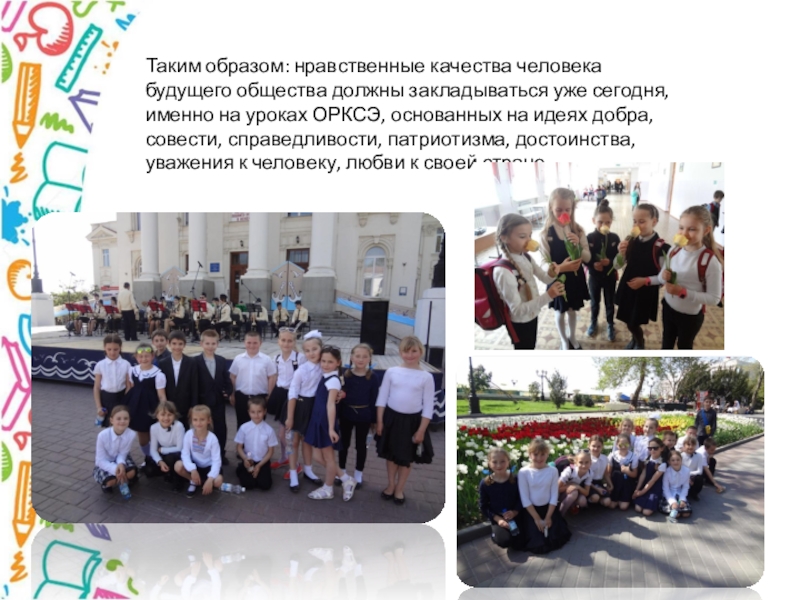 должны закладываться уже сегодня, именно на уроках ОРКСЭ, основанных на идеях добра, совести, справедливости, патриотизма, достоинства, уважения к человеку, любви к своей стране.