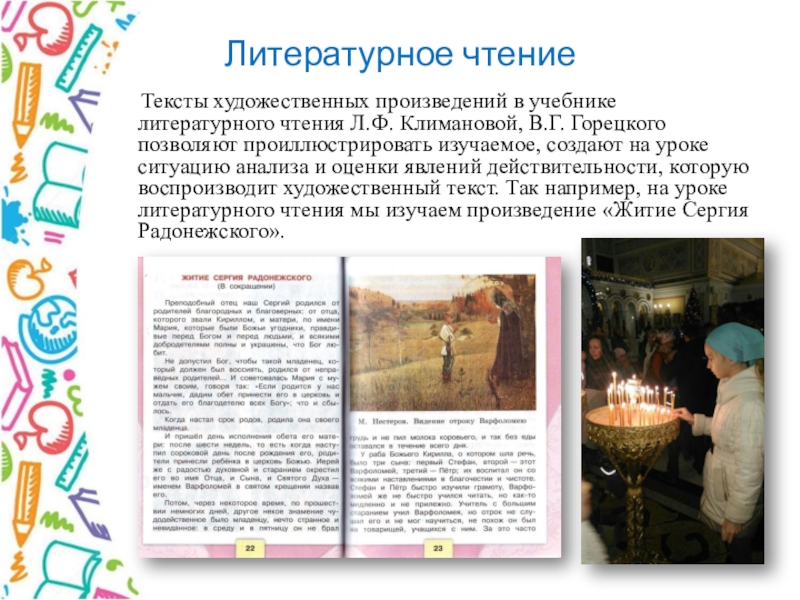 Л.Ф. Климановой, В.Г. Горецкого позволяют проиллюстрировать изучаемое, создают на уроке ситуацию анализа и оценки явлений действительности, которую воспроизводит художественный текст. Так например, на уроке литературного чтения мы изучаем произведение «Житие Сергия Радонежского».