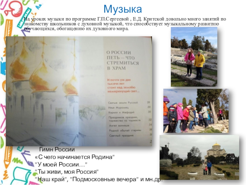 Е.Д. Критской довольно много занятий по знакомству школьников с духовной музыкой, что способствует музыкальному развитию обучающихся, обогащению их духовного мира.