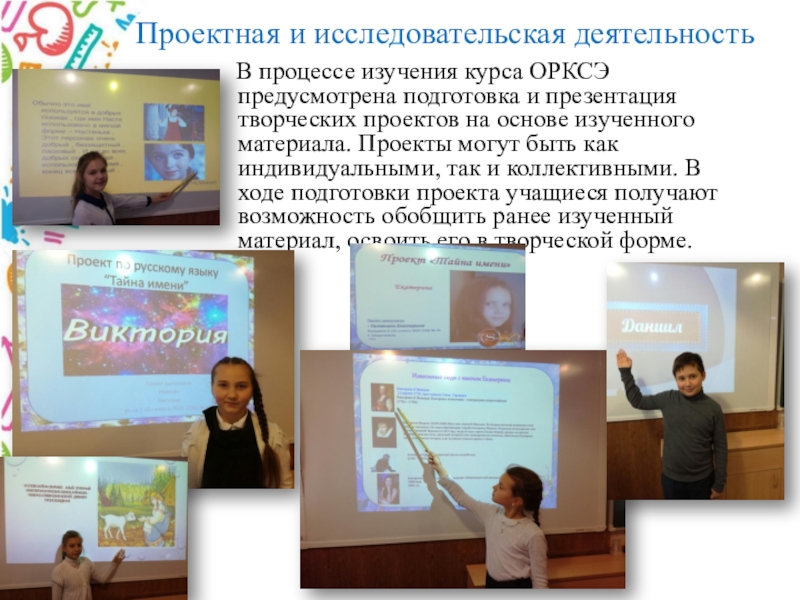 В процессе изучения курса ОРКСЭ предусмотрена подготовка и презентация творческих проектов на основе изученного материала. Проекты могут быть как индивидуальными, так и коллективными. В ходе подготовки проекта учащиеся получают возможность обобщить ранее изученный материал, освоить его в творческой форме.