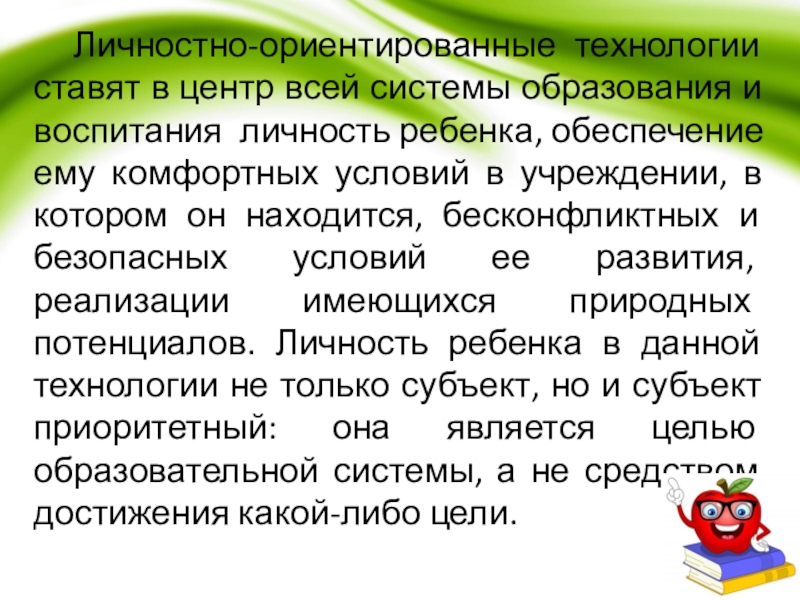 Личностно-ориентированные технологии ставят в центр всей системы образования и воспитания личность ребенка, обеспечение ему комфортных условий в