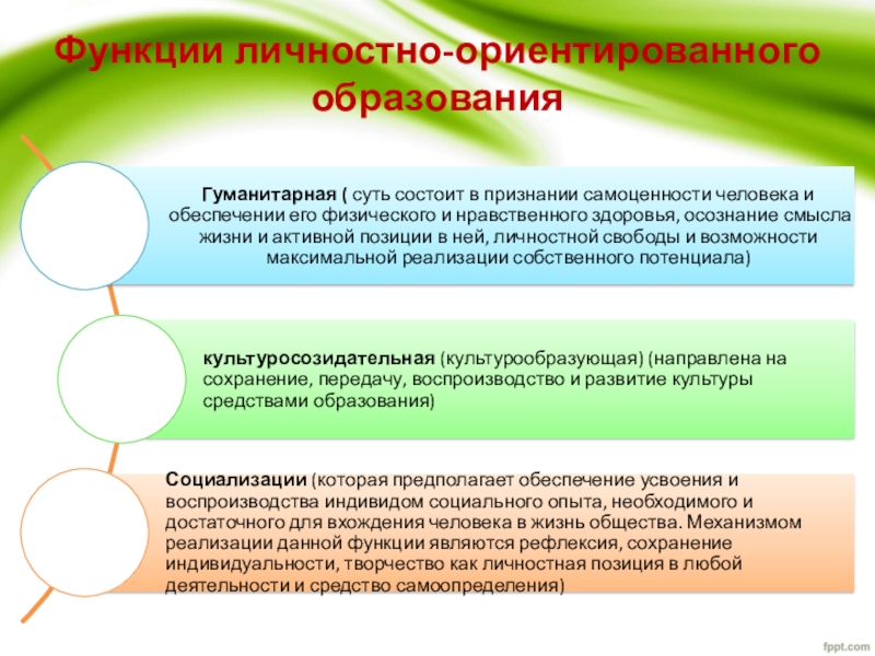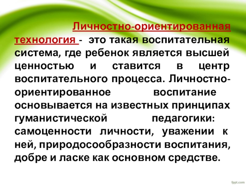 ребенок является высшей ценностью и ставится в центр воспитательного процесса. Личностно-ориентированное воспитание основывается на известных принципах гуманистической педагогики: самоценности личности, уважении к ней, природосообразности воспитания, добре и ласке как основном средстве.