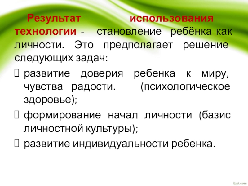Результат использования технологии -  становление ребёнка как личности. Это предполагает решение следующих задач: развитие доверия