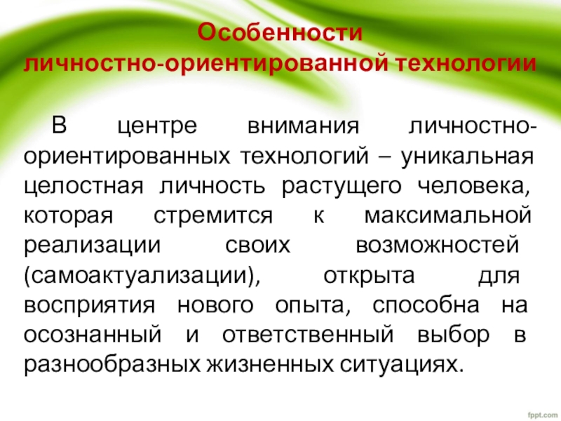 Особенности  личностно-ориентированной технологии	В центре внимания личностно-ориентированных технологий – уникальная целостная личность растущего человека, которая стремится к