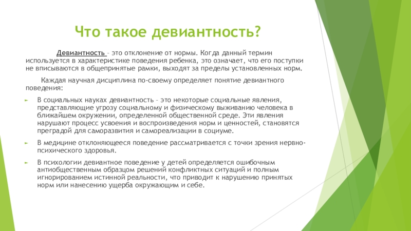 В социальных науках девиантность – это некоторые социальные явления, представляющие угрозу социальному и физическому выживанию человека в ближайшем окружении, определенной общественной среде. Эти явления нарушают процесс усвоения и воспроизведения норм и ценностей, становятся преградой для саморазвития и самореализации в социуме.