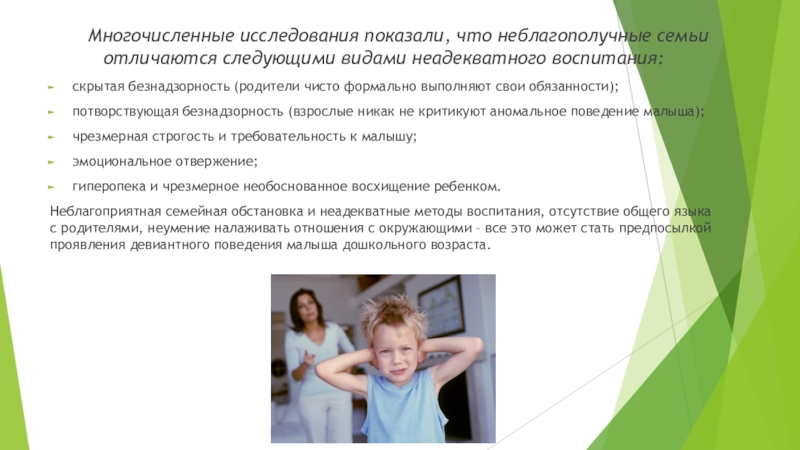 Слайд 7 Многочисленные исследования показали, что неблагополучные семьи отличаются следующими видами неадекватного воспитания: