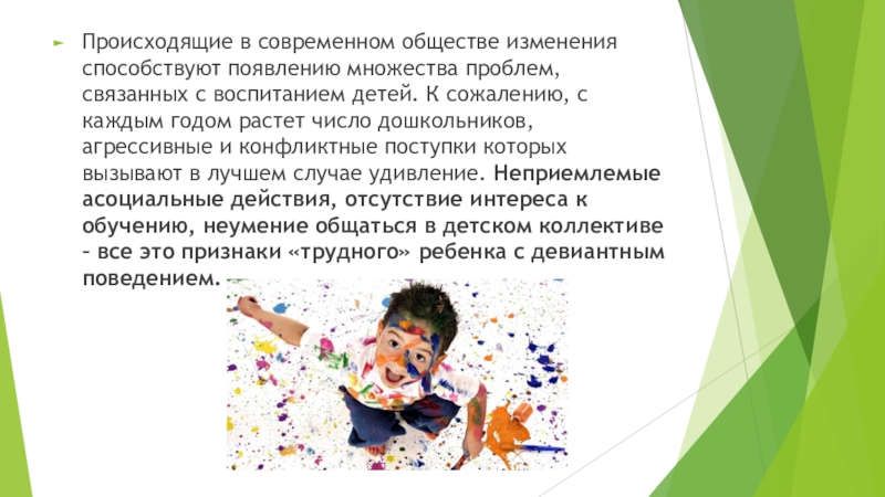 воспитанием детей. К сожалению, с каждым годом растет число дошкольников, агрессивные и конфликтные поступки которых вызывают в лучшем случае удивление. Неприемлемые асоциальные действия, отсутствие интереса к обучению, неумение общаться в детском коллективе – все это признаки «трудного» ребенка с девиантным поведением.