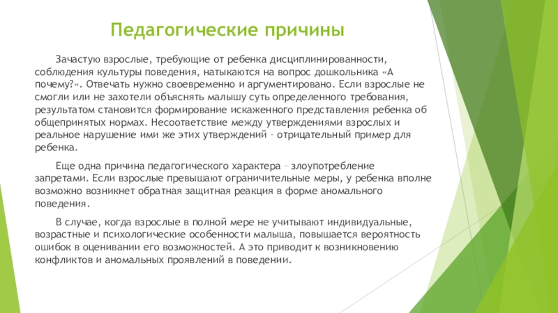Еще одна причина педагогического характера – злоупотребление запретами. Если взрослые превышают ограничительные меры, у ребенка вполне возможно возникнет обратная защитная реакция в форме аномального поведения.