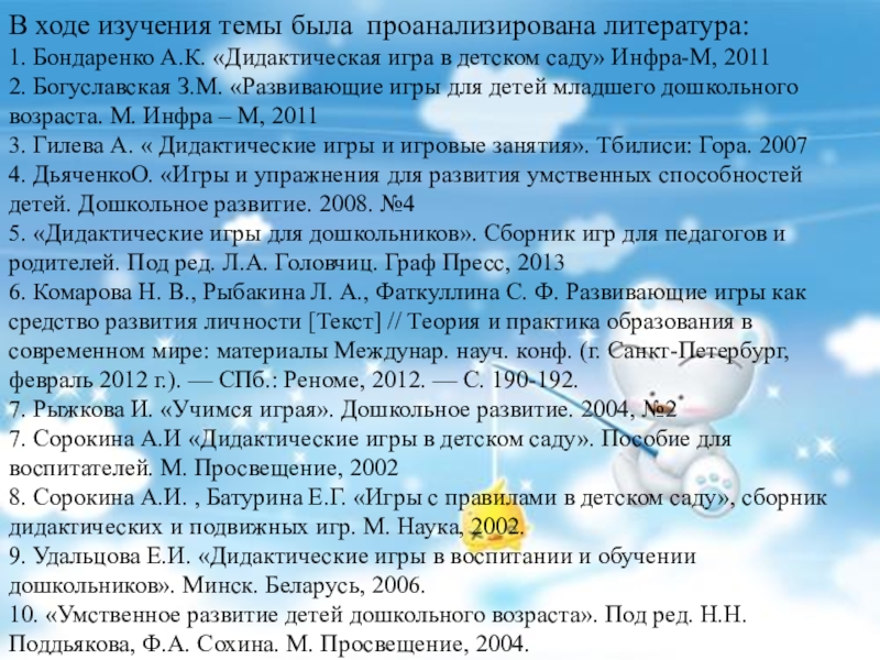 9. Удальцова Е.И. «Дидактические игры в воспитании и обучении дошкольников». Минск. Беларусь, 2006.