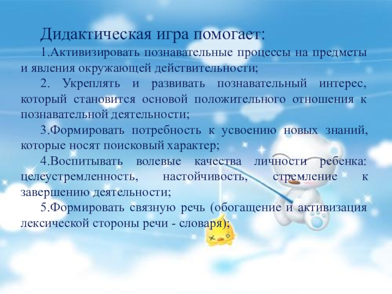 1. Раскрыть значение дидактических игр в развитии познавательных способностей дошкольников.
