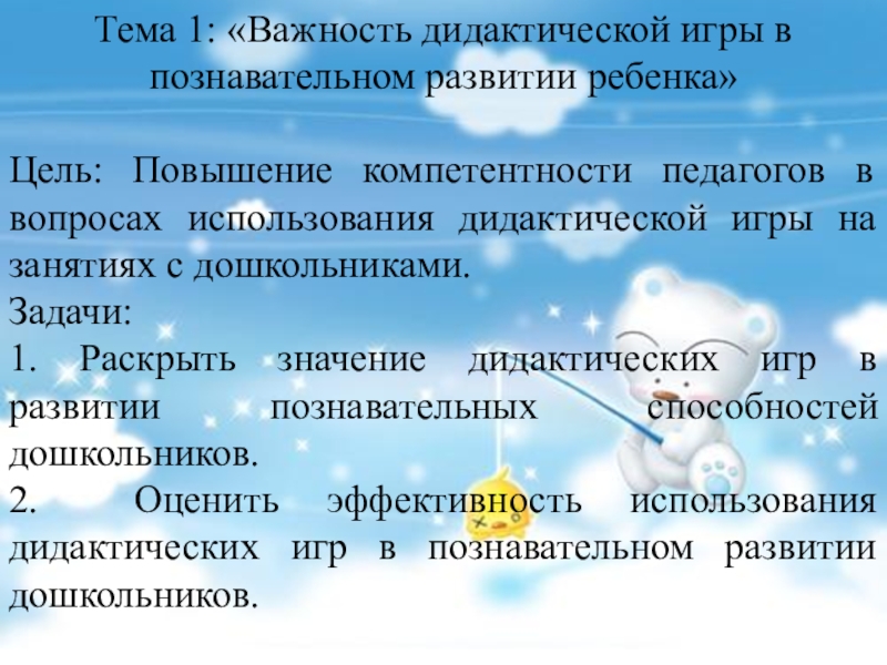 Слайд 3Тема 1: «Важность дидактической игры в познавательном развитии ребенка»