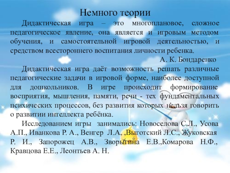 Исследованием игры занимались: Новоселова С.Л., Усова А.П., Иванкова Р. А., Венгер Л.А, ,Выготский Л.С., Жуковская Р. И., Запорожец А.В., Зворыгина Е.В.,Комарова Н.Ф., Кравцова Е.Е., Леонтьев А. Н.