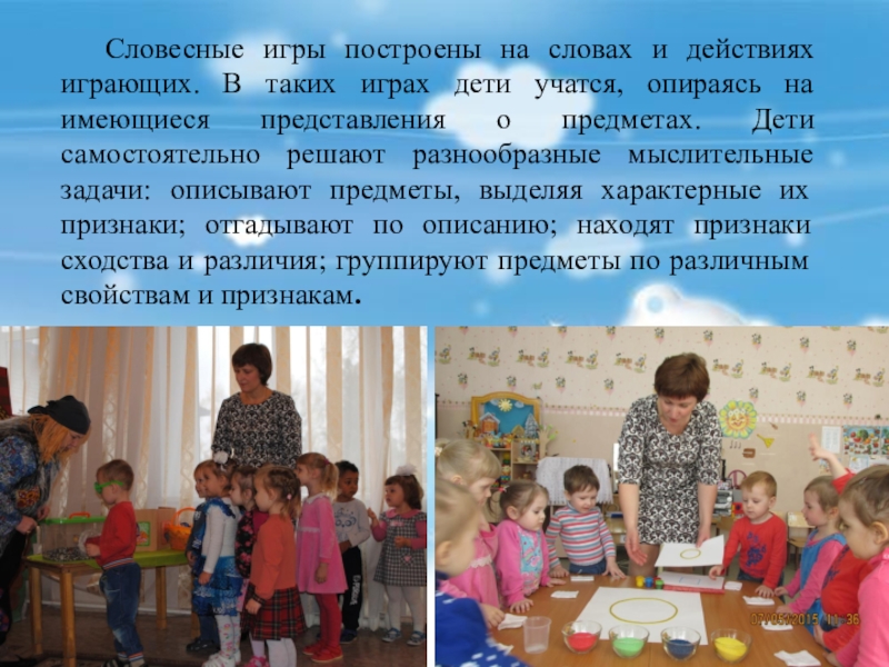 играх дети учатся, опираясь на имеющиеся представления о предметах. Дети самостоятельно решают разнообразные мыслительные задачи: описывают предметы, выделяя характерные их признаки; отгадывают по описанию; находят признаки сходства и различия; группируют предметы по различным свойствам и признакам.