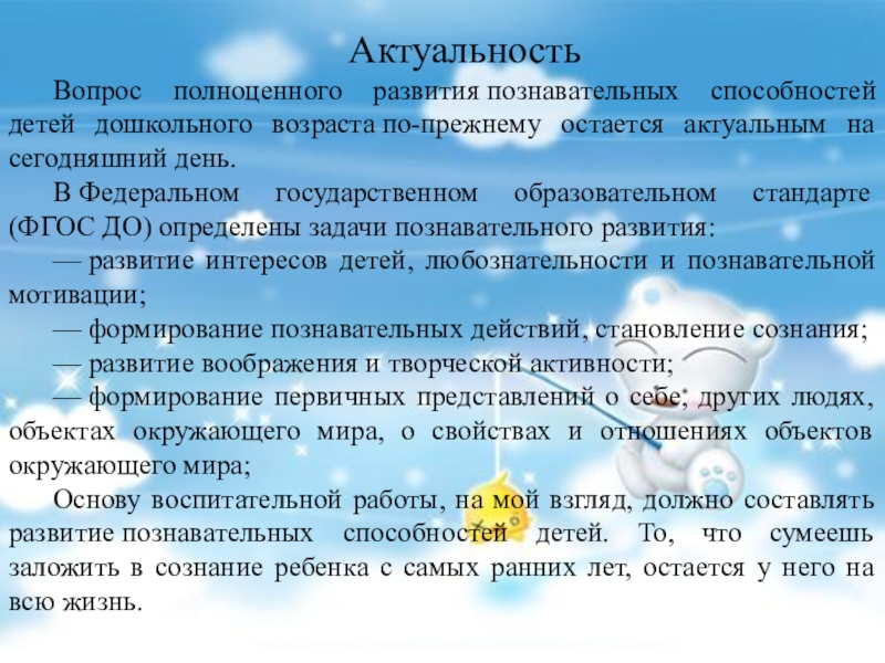 Вопрос полноценного развития познавательных способностей детей дошкольного возраста по-прежнему остается актуальным