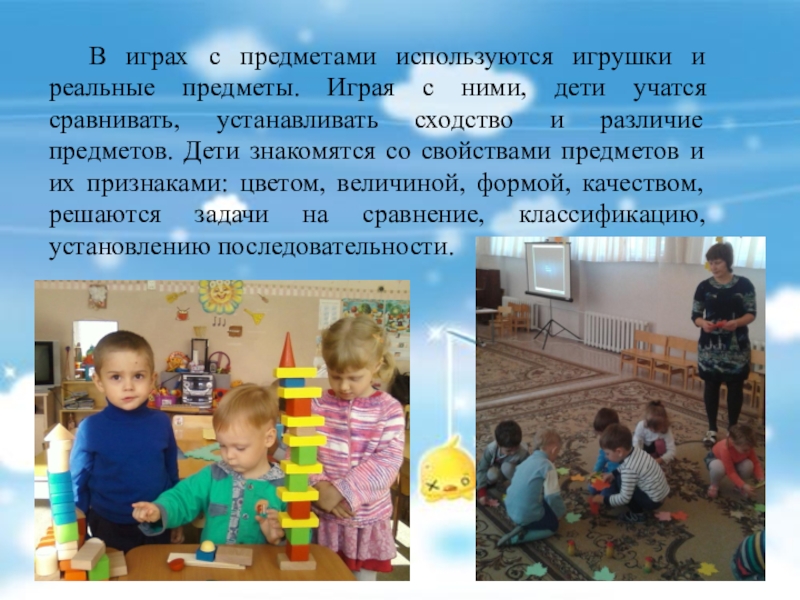 Слайд 9В играх с предметами используются игрушки и реальные предметы. Играя с