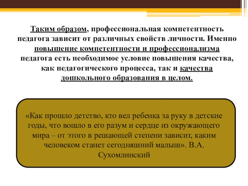 «Как прошло детство, кто вел ребенка за руку в детские годы, что вошло в его разум и сердце из окружающего мира – от этого в решающей степени зависит, каким человеком станет сегодняшний малыш». В.А.Сухомлинский