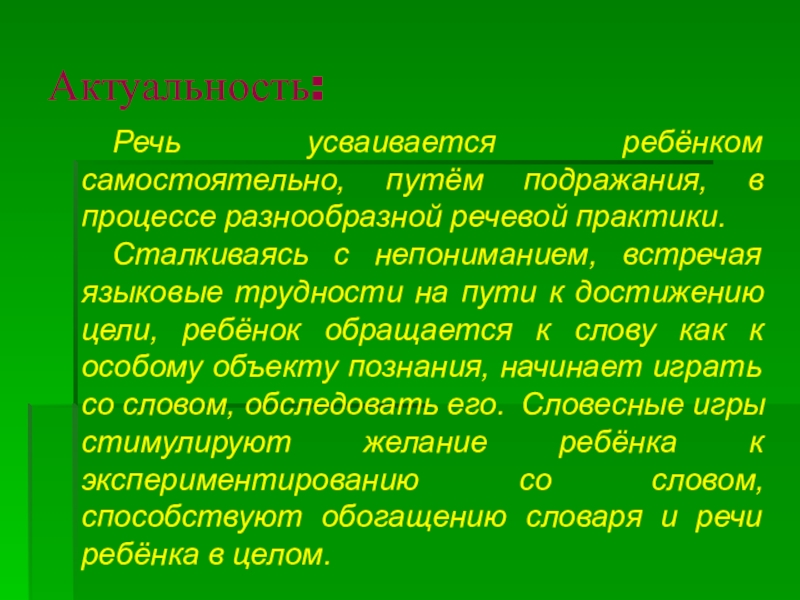 с непониманием, встречая языковые трудности на пути к достижению цели, ребёнок обращается к слову как к особому объекту познания, начинает играть со словом, обследовать его. Словесные игры стимулируют желание ребёнка к экспериментированию со словом, способствуют обогащению словаря и речи ребёнка в целом.