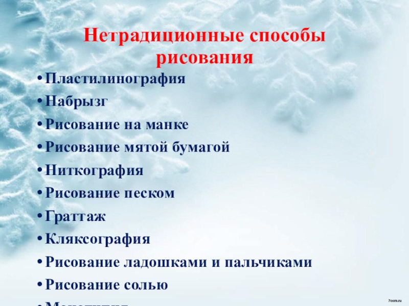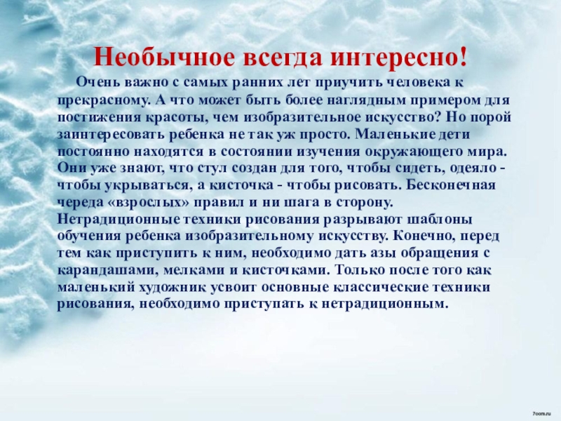 приучить человека к прекрасному. А что может быть более наглядным примером для постижения красоты, чем изобразительное искусство? Но порой заинтересовать ребенка не так уж просто. Маленькие дети постоянно находятся в состоянии изучения окружающего мира. Они уже знают, что стул создан для того, чтобы сидеть, одеяло - чтобы укрываться, а кисточка - чтобы рисовать. Бесконечная череда «взрослых» правил и ни шага в сторону. Нетрадиционные техники рисования разрывают шаблоны обучения ребенка изобразительному искусству. Конечно, перед тем как приступить к ним, необходимо дать азы обращения с карандашами, мелками и кисточками. Только после того как маленький художник усвоит основные классические техники рисования, необходимо приступать к нетрадиционным.