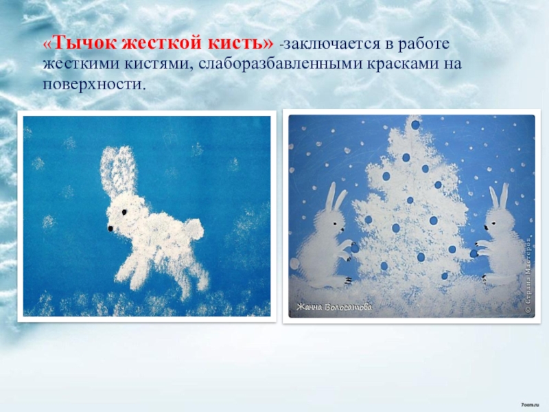 Слайд 17«Тычок жесткой кисть» -заключается в работе жесткими кистями, слаборазбавленными красками на