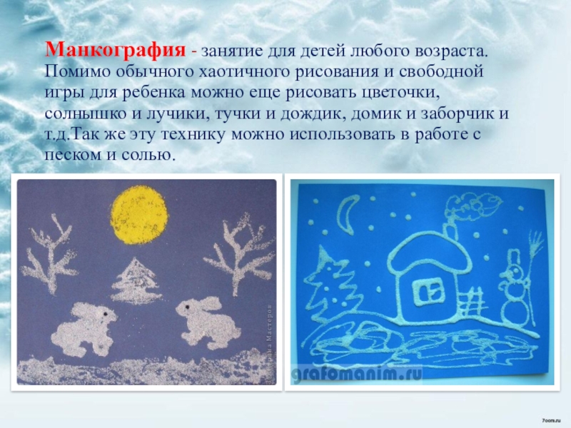 Слайд 8Манкография - занятие для детей любого возраста. Помимо обычного хаотичного рисования