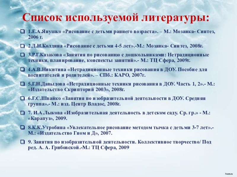 3.Р.Г.Казакова «Занятия по рисованию с дошкольниками: Нетрадиционные техники, планирование, конспекты занятий».- М.: ТЦ Сфера, 2009г.
