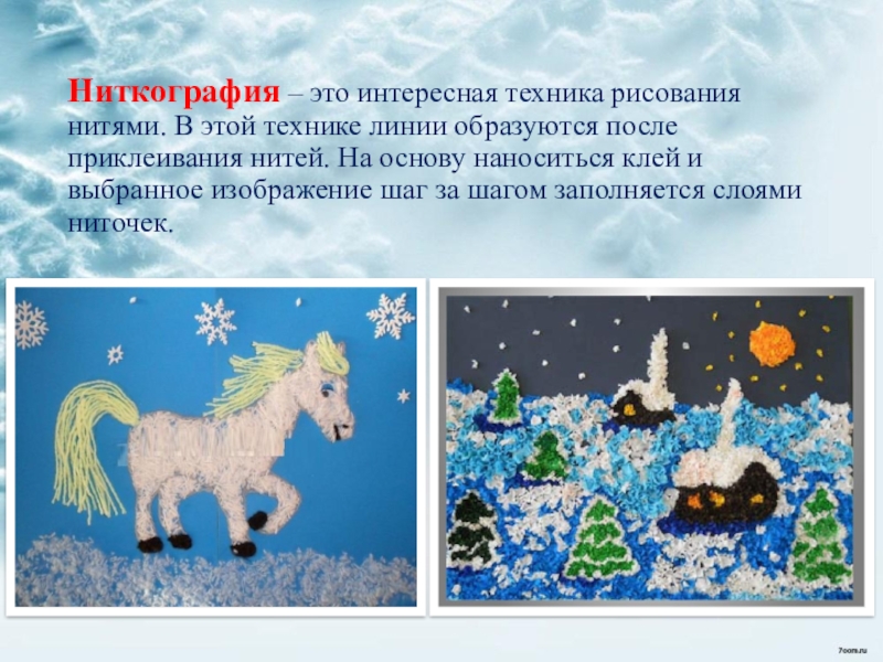 Слайд 10Ниткография – это интересная техника рисования нитями. В этой технике линии
