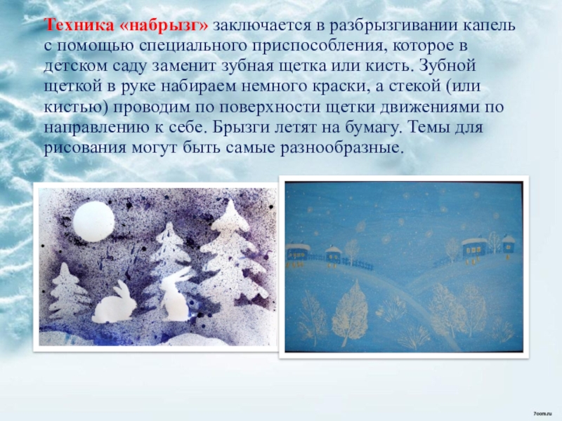 Слайд 7Техника «набрызг» заключается в разбрызгивании капель с помощью специального приспособления, которое в