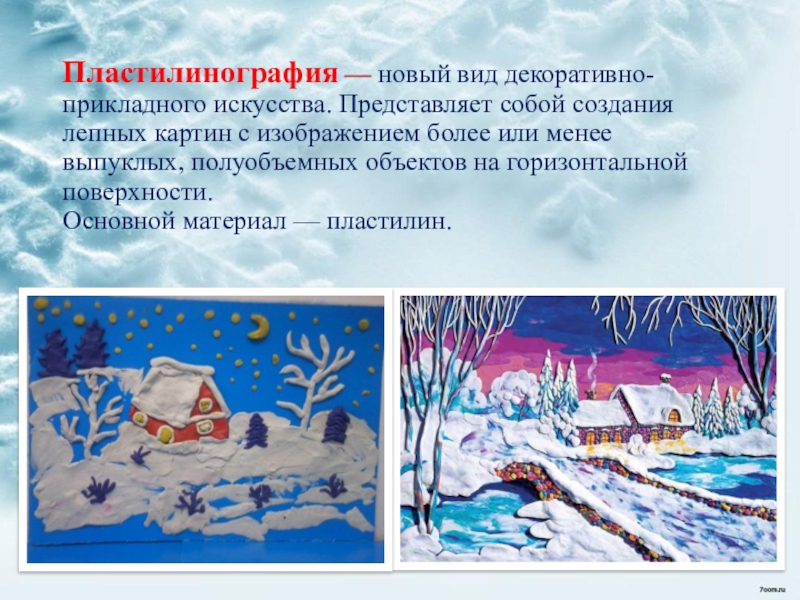 Слайд 6Пластилинография — новый вид декоративно-прикладного искусства. Представляет собой создания лепных картин с изображением