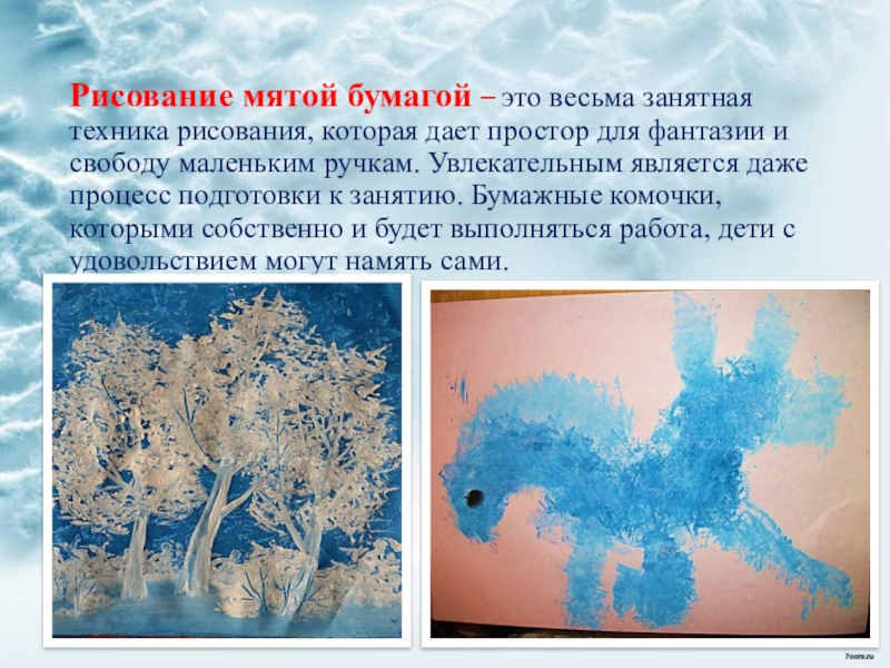 Слайд 9Рисование мятой бумагой – это весьма занятная техника рисования, которая дает