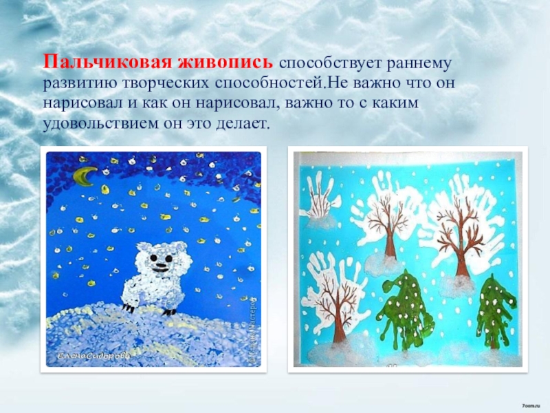 Слайд 13Пальчиковая живопись способствует раннему развитию творческих способностей.Не важно что он нарисовал