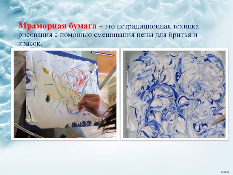 Слайд 15Мраморная бумага – это нетрадиционная техника рисования с помощью смешивания пены