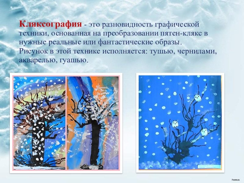 Слайд 12Кляксография - это разновидность графической техники, основанная на преобразовании пятен-клякс в нужные