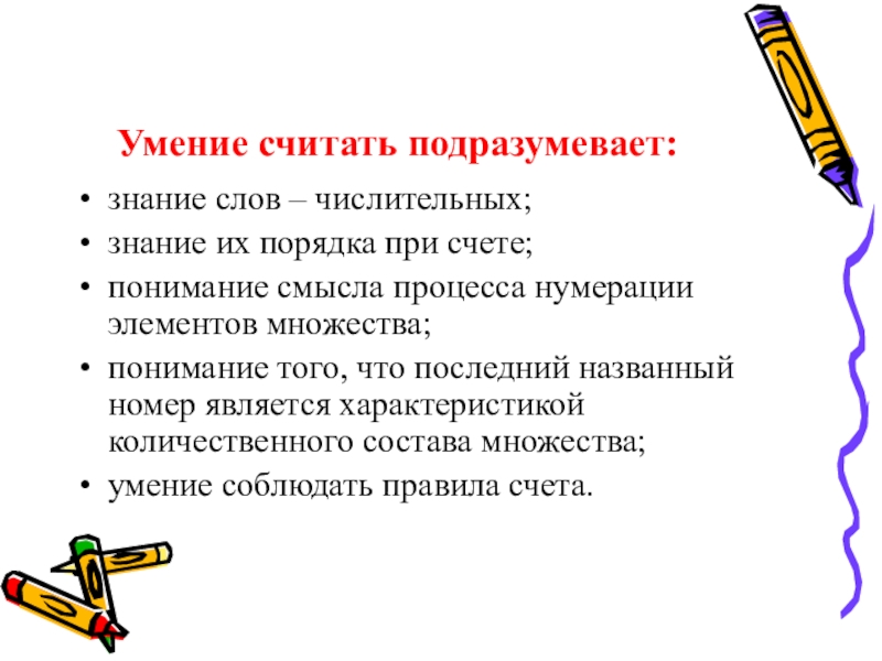 Умение считать подразумевает:знание слов – числительных;знание их порядка при счете;понимание смысла процесса нумерации элементов множества; понимание того,