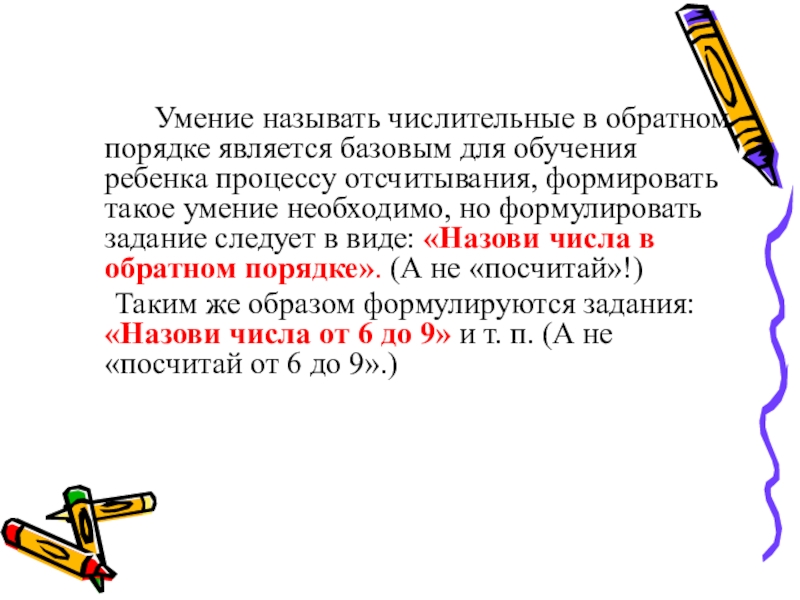 процессу отсчитывания, формировать такое умение необходимо, но формулировать задание следует в виде: «Назови числа в обратном порядке». (А не «посчитай»!)