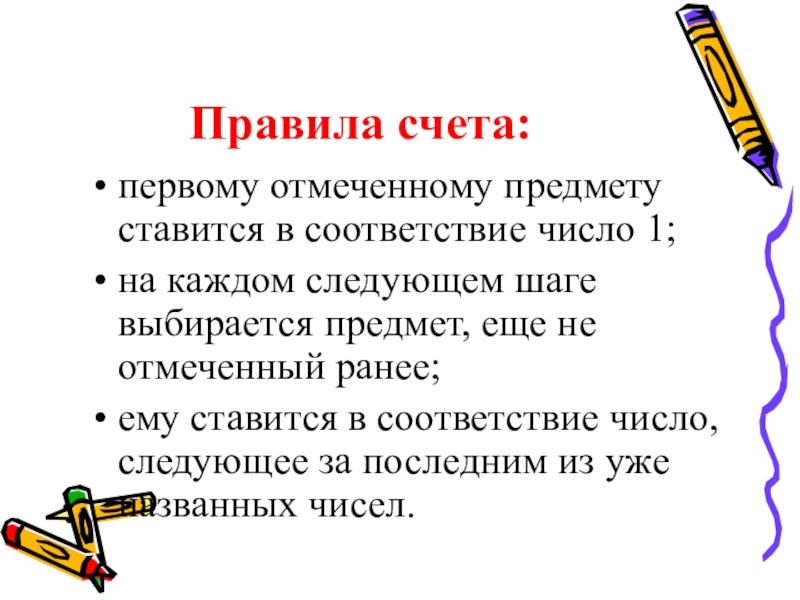 Правила счета:первому отмеченному предмету ставится в соответствие число 1;на каждом следующем шаге выбирается предмет, еще не отмеченный