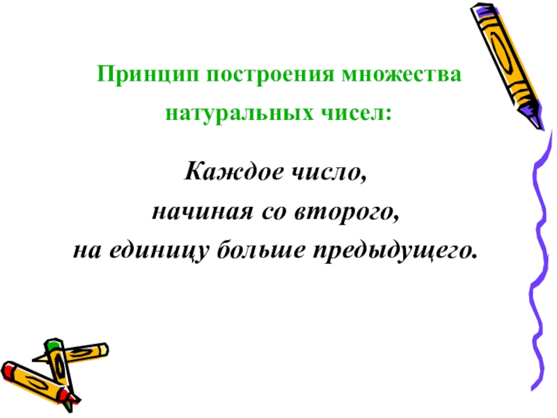 Принцип построения множества натуральных чисел: Каждое число, начиная со второго, на единицу больше предыдущего.