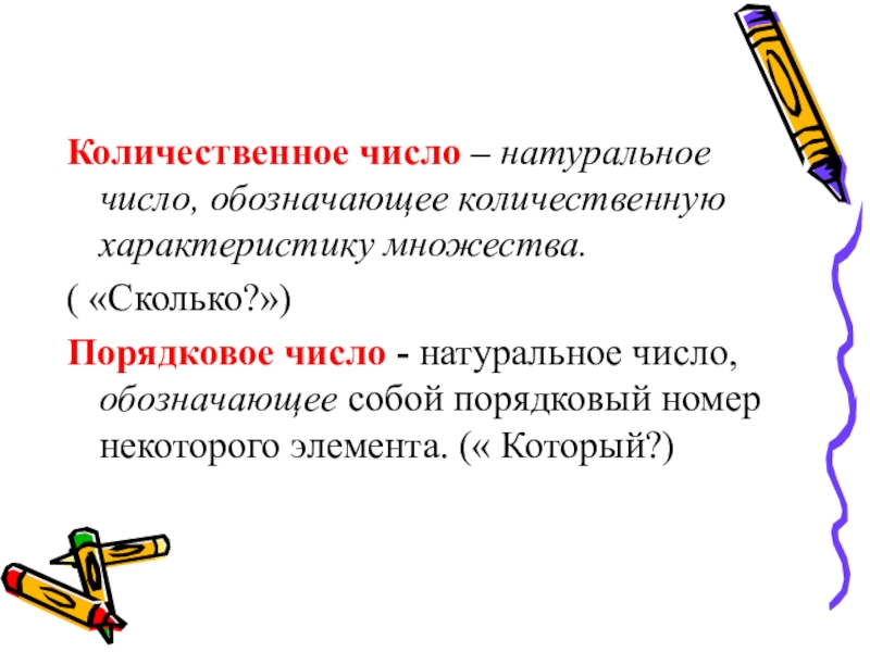Количественное число – натуральное число, обозначающее количественную характеристику множества. ( «Сколько?»)Порядковое число - натуральное число, обозначающее собой