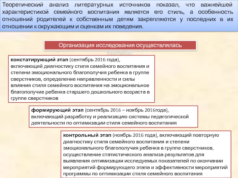 констатирующий этап (сентябрь 2016 года), включающий диагностику стиля семейного воспитания и степени эмоционального благополучия ребенка в группе сверстников, определение направленности и силы влияния стиля семейного воспитания на эмоциональное благополучие ребенка старшего дошкольного возраста в группе сверстников