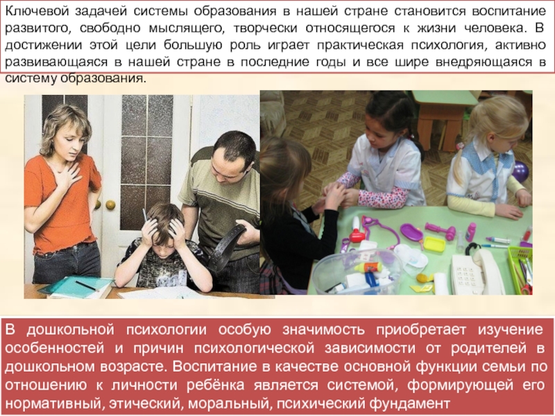 В дошкольной психологии особую значимость приобретает изучение особенностей и причин психологической зависимости от родителей в дошкольном возрасте. Воспитание в качестве основной функции семьи по отношению к личности ребёнка является системой, формирующей его нормативный, этический, моральный, психический фундамент