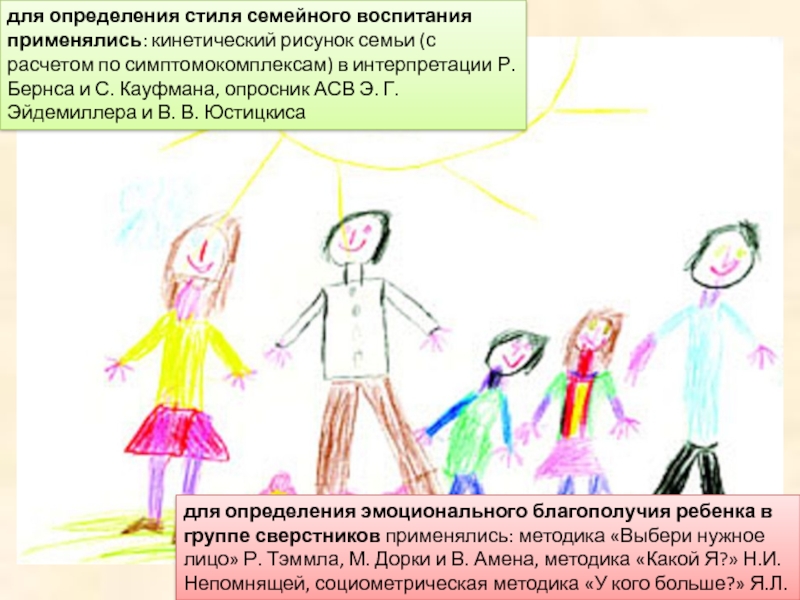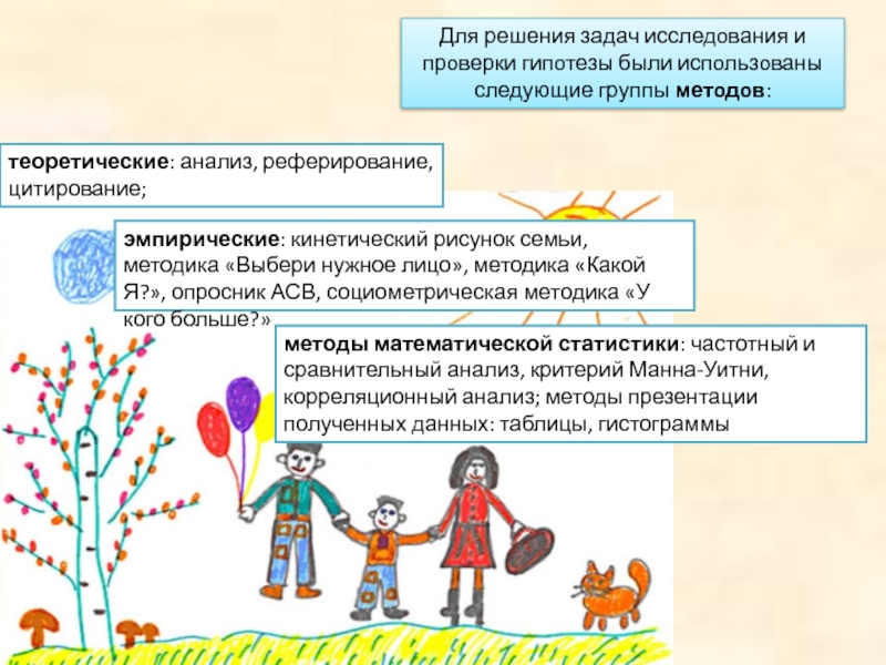 эмпирические: кинетический рисунок семьи, методика «Выбери нужное лицо», методика «Какой Я?», опросник АСВ, социометрическая методика «У кого больше?»