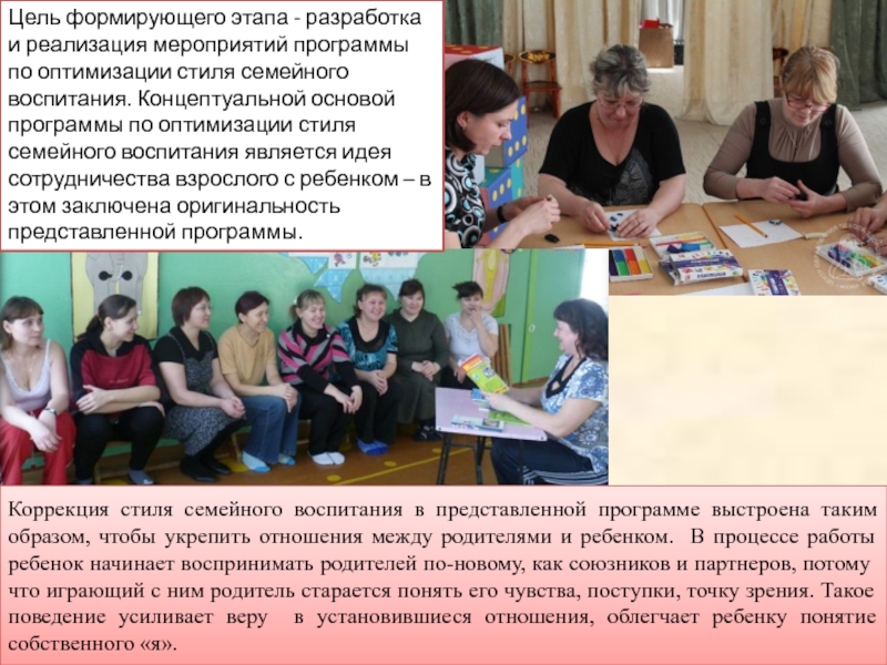 Цель формирующего этапа - разработка и реализация мероприятий программы по оптимизации стиля семейного воспитания. Концептуальной основой программы по оптимизации стиля семейного воспитания является идея сотрудничества взрослого с ребенком – в этом заключена оригинальность представленной программы.